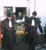 Pallbearers in black capes trimmed in gold.
