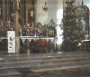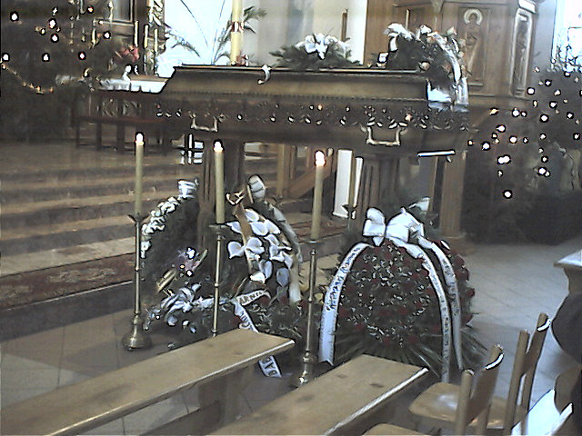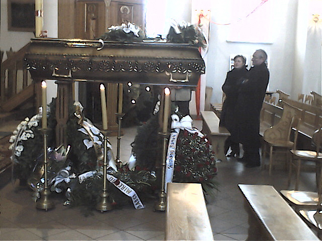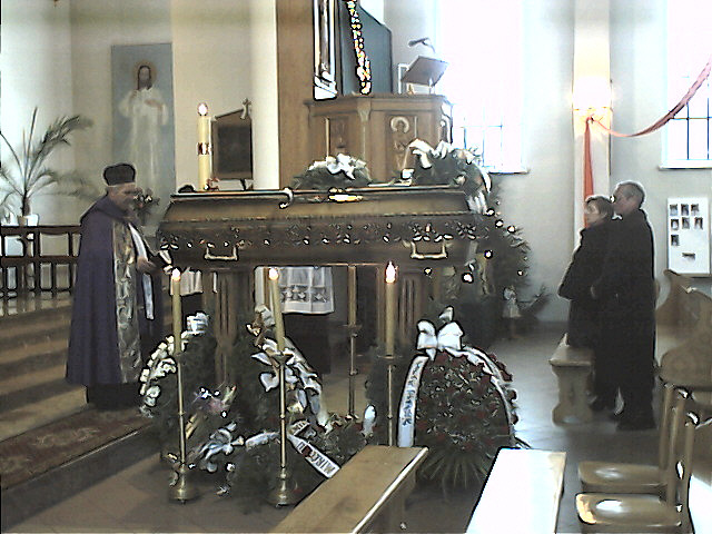 Trumna przed ołtarzem.