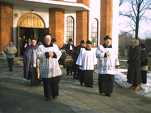 Orszak wychodzi z kościoła na cmentarz. The procession leaves the church for the cemetery.