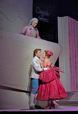 The set consisted of a series of huge pages of a book, which would turn as the actions progressed to various venues around the world. As befits its farcical premise, based on the satirical 1759 novel of the same name by Voltaire, the action was performed with gleeful antics and high abandon, but not descending into slapstick.
