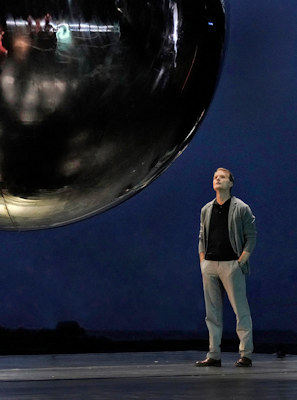 Set design was very spare, as in Shakespearean theater, because as with the Bard, the story depended on words, not visuals. The only stage item, other than small pieces of furniture carried in and out for interior scenes, was a huge omni-present reflective sphere suspended from the flies, representing the bomb and nuclear weapons in general. This was a change from previous productions, where the bomb was portrayed more realistically as a lumpy object with wires attached. There were some surrealistic elements, as when dancers in bright red costumes several times wove their way about the stage, seemingly unseen by the major characters. I very much enjoyed the staging, by Peter Sellars, who designed all the other incarnations of this work, but revised this one in a major way. Barbara was less enthused.