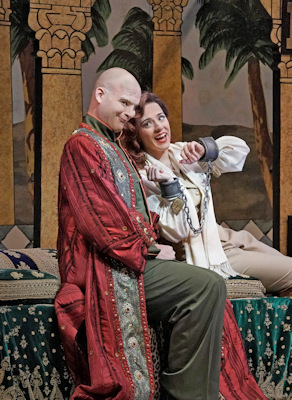 Singing was, for the most part, very good. I especially liked tenor Jack Swanson as the romantic lead and bass Scott Conner as Mustafa. There was one major disappointment: mezzo Daniela Mack in the title role. Although a great stage actress, her voice is uneven - dazzling at full volume at the high end, but drab and weak in the middle and lower registers where a mezzo is supposed to shine. She was upstaged by the strong, uniformly even voice of soprano Stacey Geyer, a member of SFeO's apprentice program singing her first featured role in an A-list house, in the secondary role of Elvira, Mustafa's neglected wife.